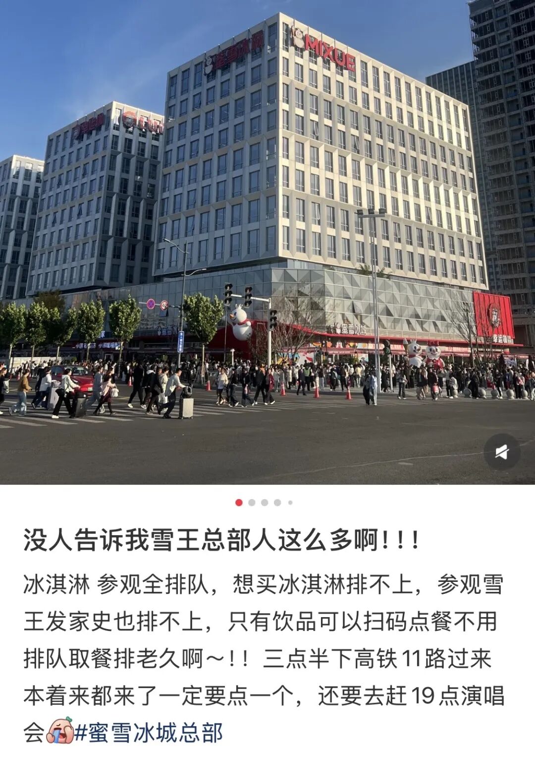 几乎每一个节假日,位于郑州东站旁的蜜雪冰城总部,都会被本地粉丝和各路朝圣大军攻陷,小红书上不少人都在自发分享各种总部打卡攻略,从出片机位、游览顺序到周边抢购,应有尽有,好不热闹,为数不多的“避雷帖”吐槽的也是因为排队的人实在太多轮到自己时已经抢不到好货了。
