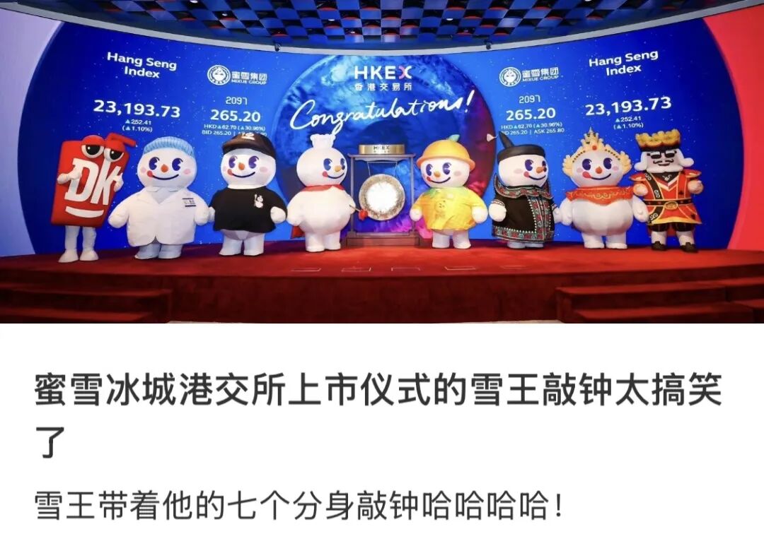 这些年来,雪王留下过很多让人印象深刻的瞬间,但或许都比不过去年3月在港交所敲钟上市时“八王敲锣”的名场面,在港交所这个充满资本和精英气息的地方,雪王和它的七个小伙伴在台上活蹦乱跳的场景成了永恒的经典,谁说搞抽象登不了大雅之堂。