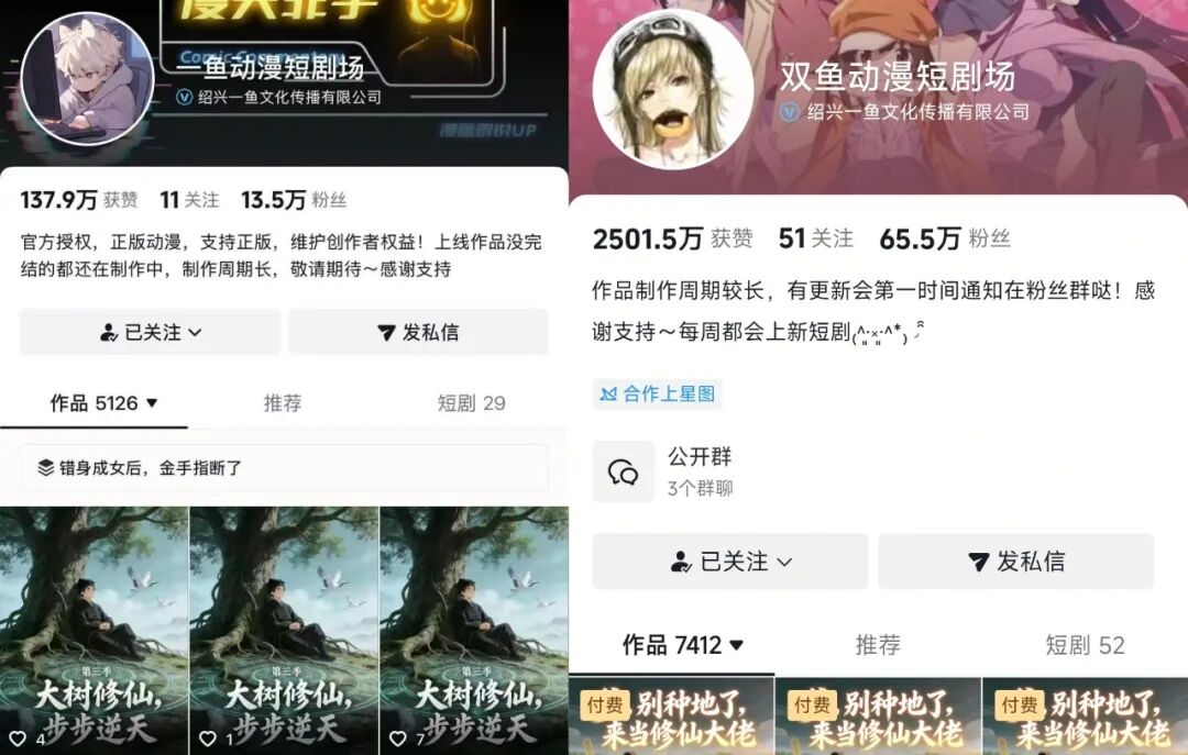 一方面,余禾文化推出旗下漫剧厂牌,包括主账号“一鱼动漫剧场”和“双鱼动漫剧场”,与动漫垂类账号形成矩阵,总粉丝体量约200万,为漫剧传播提供了稳定的用户基本盘和内容传播网。