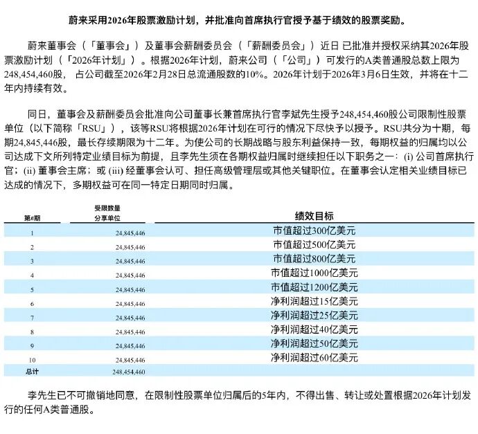 根据官方公告,这份2026年股份激励计划,要给李斌授予2.48亿股A类普通股,占到蔚来截至2月底总流通股数的10%。