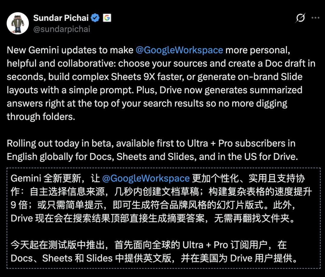 从Gmail到Docs、Sheets、Slides、Drive,再到未来可能推进的Calendar、自动化流程乃至跨产品协作,谷歌正在把AI从一个外挂,变成整套办公产品的底层交互逻辑。