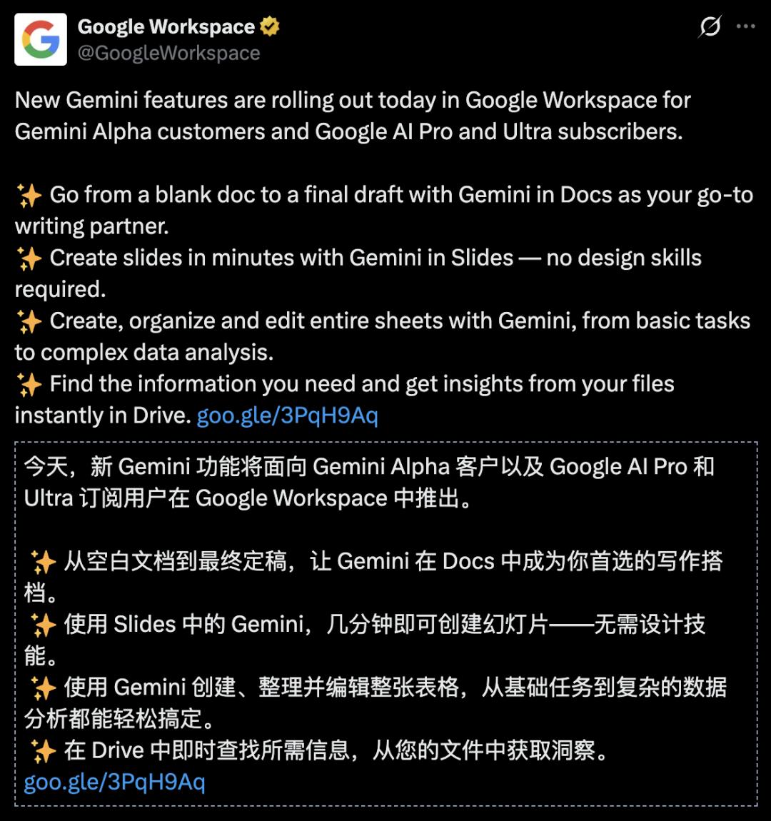 这无疑是谷歌AI的一次胜利——3亿谷歌Workshop用户无缝衔接,不需要下载新应用、学习新工作流,AI直接出现在他们早已工作的地方,让用户提速增效。