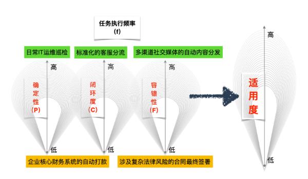 为了直观地理解这种制约,可以从四个维度来评估一项任务是否适合交给自主智能体:工作流的逻辑确定性(P,Predictability)、失败的风险容错度(F,Fault Tolerance)、环境的数字化闭环程度(C,Digital Closure),以及任务的执行频率(f)。四者的关系可以简化表达为:S = F × P × C × f。其中,频率f是放大因素——越是高频重复的工作,越适合交给智能体执行。