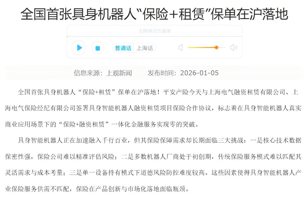 对此,险企正在加速布局。例如人保财险与擎天租合作,为超2000台机器人配置超2亿元保险,覆盖本体损失与第三者责任;平安产险落地全国首张具身机器人“保险+融资租赁”保单,创新涵盖产品设计缺陷、黑客攻击等情形;太保产险推出“机智保”,支持按天、周、月投保,精准适配多种商业场景。