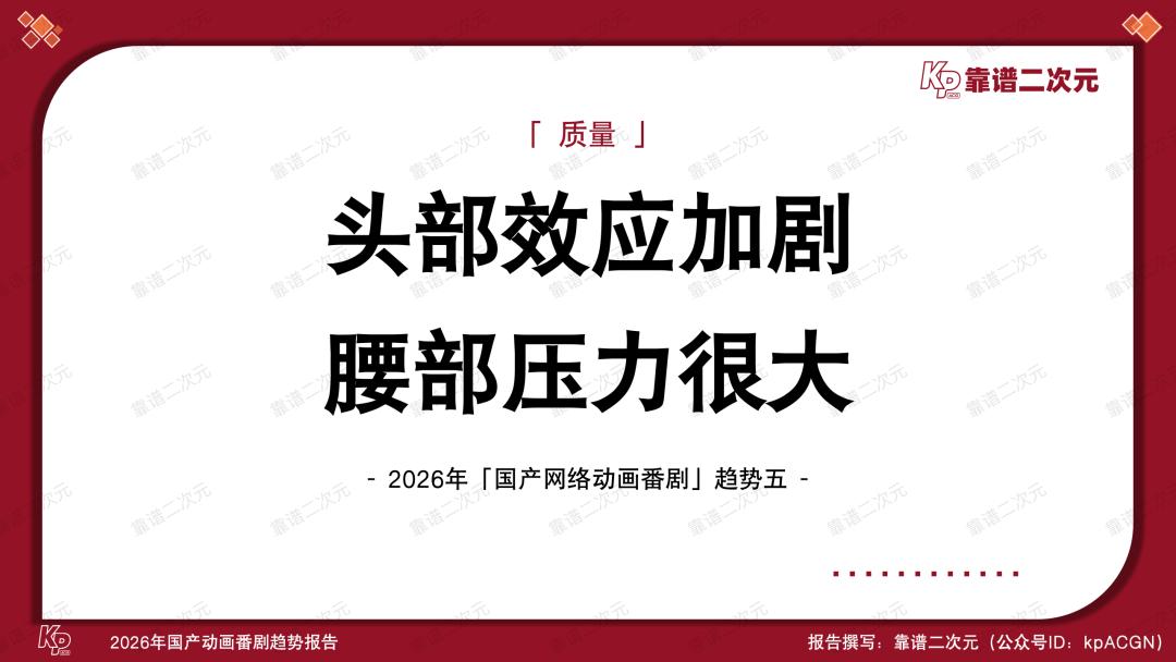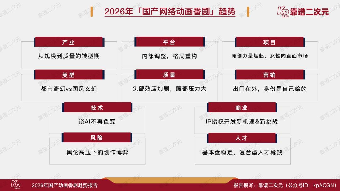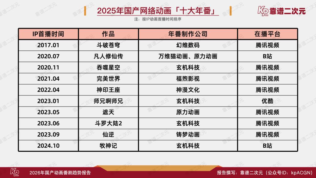 通过盘点2025年国产网络动画番剧播出数据和26-27周期待播片单,对比历年产业情况,结合多年来与从业者深入交流的经验,靠谱二次元(公众号ID:kpACGN)得出2026年国产动画番剧的「十大趋势」,接下来根据产业现状进行逐条解析。
