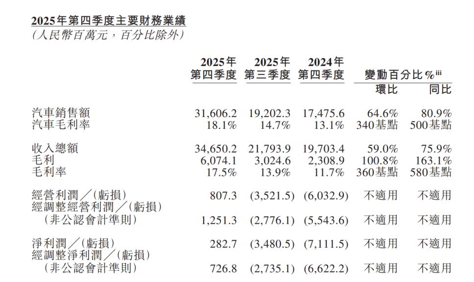 蔚来2025年第四季度主要财务业绩 图源:蔚来2025年第四季度及全年业绩公告