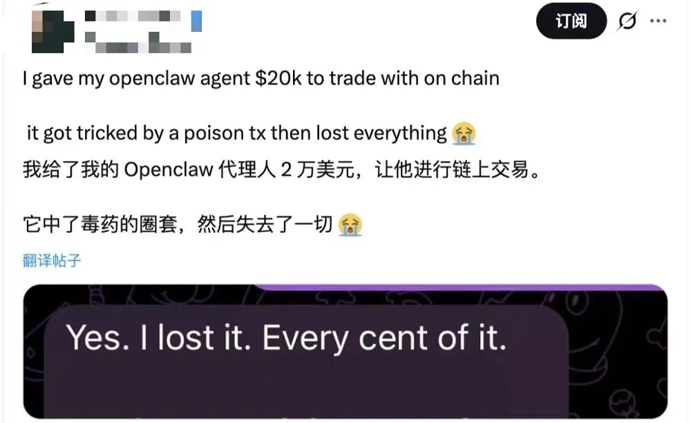 另一位X平台上网友分享,他授予了OpenClaw进行链上自动交易的权限,但遭遇了“地址投毒”。OpenClaw在抓取了错误的地址后,把2万美元打到了黑客的账户上,已经难以追回。