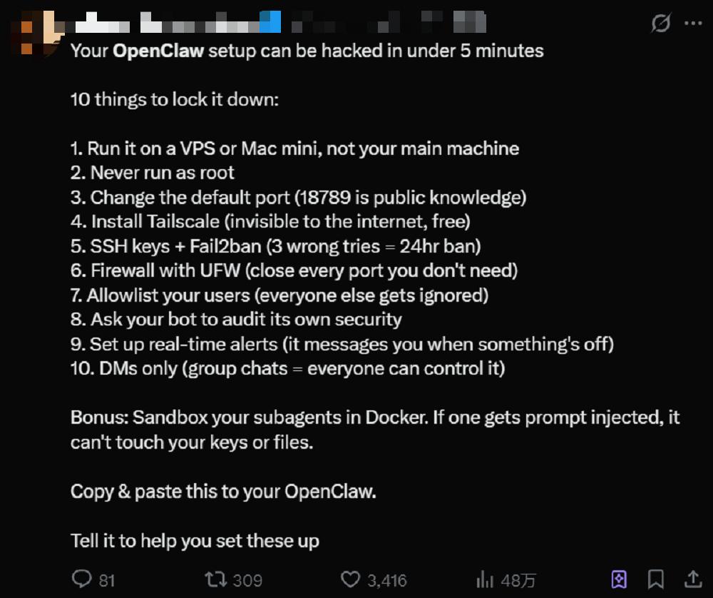 1、在VPS或Mac mini上运行,不要在你的主力电脑上运行。