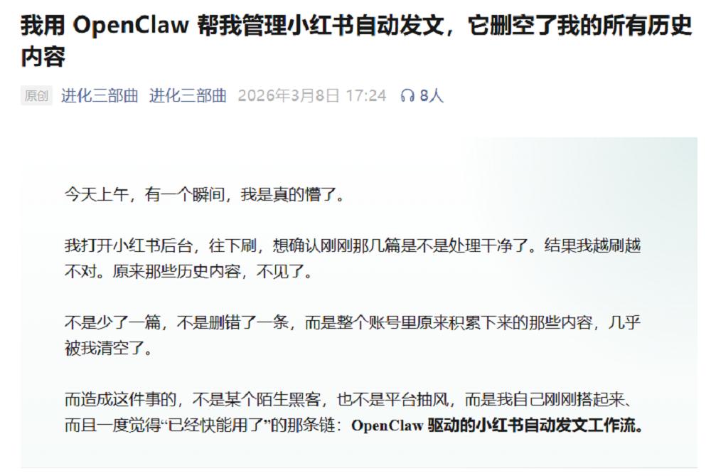 微信公众号“进化三部曲”的运营者则遇到了OpenClaw误删小红书帖子的问题。他打造的OpenClaw小红书自动发文工作流接入了真实生产账号,但在给出“删除内容”的指令时没有明确边界,最终所有帖子都被清空了。