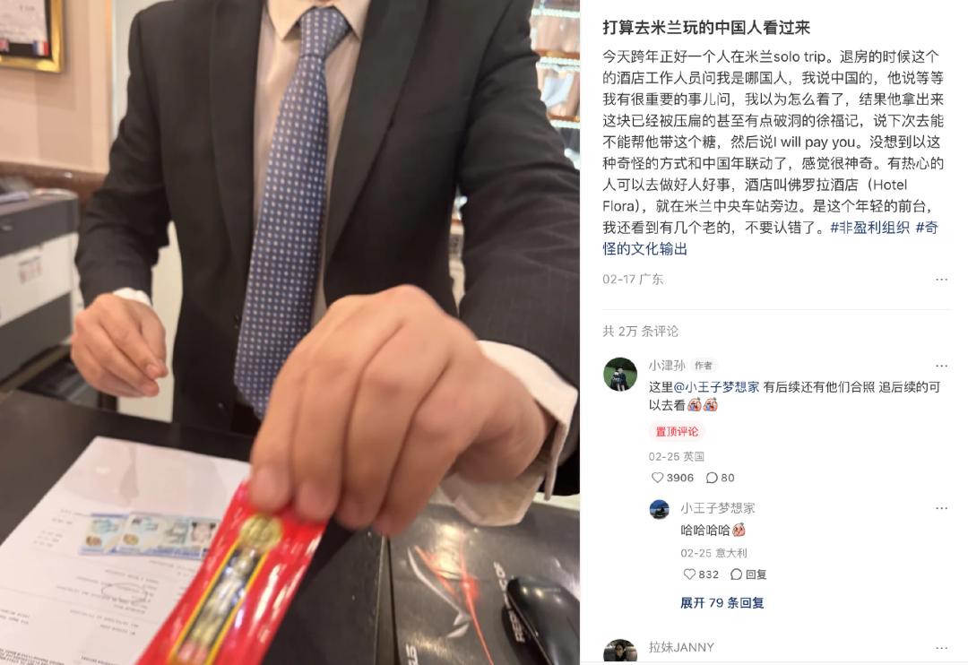 米兰的游客和留学生们像突然发现了某个「地球Online」游戏支线任务,热火朝天地行动了起来。这篇帖子的浏览量很快突破了百万:不少人留言说自己马上准备去米兰,可以带徐福记去。跨国送糖的排期一路从2月排到了5月,“给外国人一点热心中国人的震撼。”