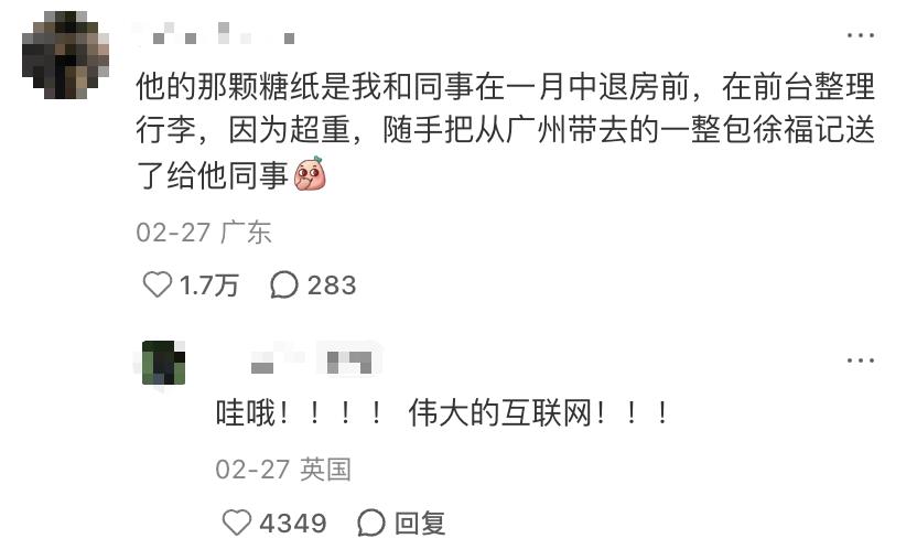 “接力送徐福记”的帖子发布后,最初送出那颗徐福记的好心人也现身解释:自己一月中旬在意大利出差时入住了这家酒店,退房时因为行李超重,随手把一整包徐福记送给了前台。