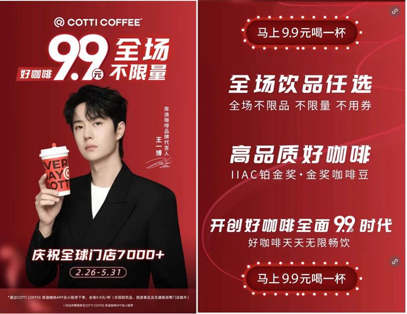 2023年2月,库迪开启“百城千店咖啡狂欢节”,70余款产品均9.9元起促销。同年4月,瑞幸陆续在附近新开了库迪的门店投放9.9元优惠券,6月,瑞幸在达成万店的节点将9.9元优惠券铺向全国门店。