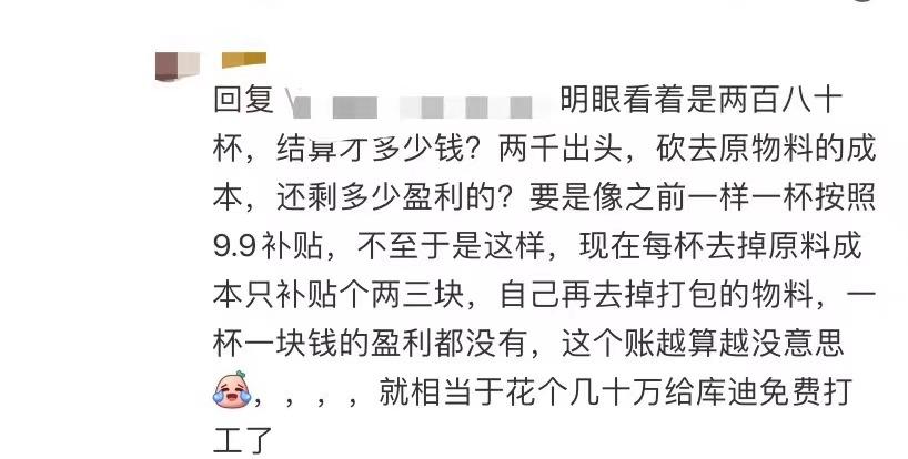 在小红书等社交平台上,有不少库迪的加盟商表示“难以回本”。其中,有一位位于云南的加盟商提到,“一个月营业额9万左右,付完供应款、房租、员工工资,一分不剩!就是免费给库迪打工。”这并非个例,另一位湖北的加盟商也提到,“日均两百八十杯,两个员工的工资加水电房租,一点没有赚的,还亏损了两三千。”