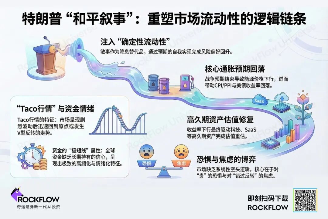 这不仅是一场关于地缘政治的博弈,更是 2026 年宏观范式的缩影。在 RockFlow 投研团队看来,这意味着地缘溢价的“半衰期”正急剧缩短,而美国财政与外交叙事对金融市场的干预,已成为美股投资框架中不可低估的内生变量。