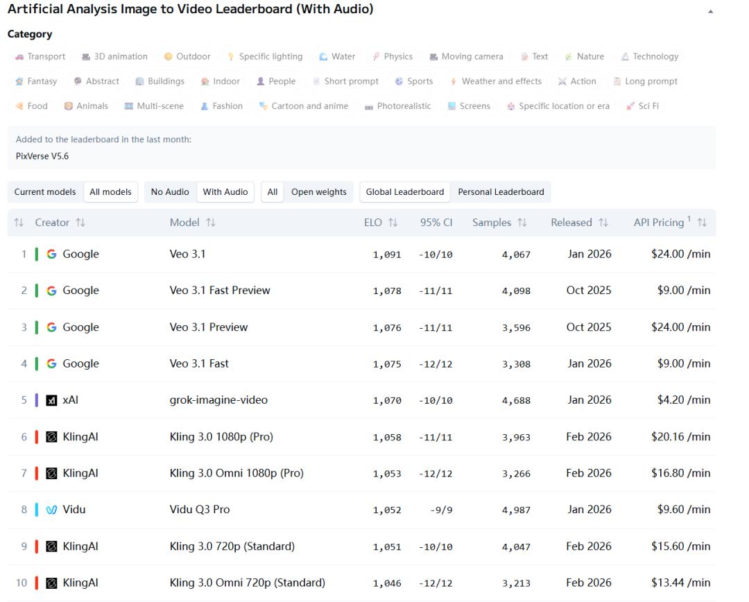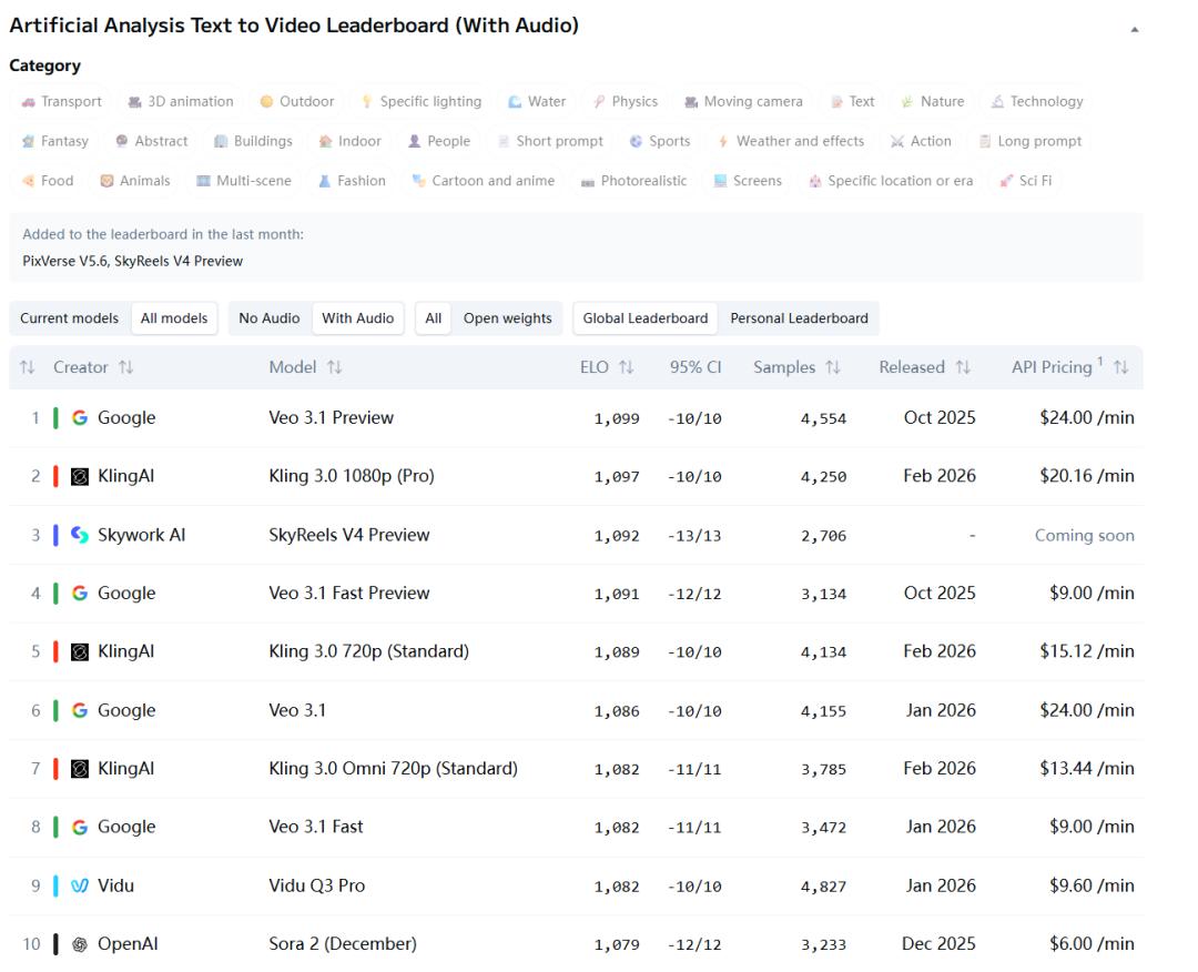 全球权威AI测评机构Artificial Analysis发布的最新榜单中,无论是文生视频还是图生视频,Kling 3.0均名列前茅。除谷歌的Veo系列、OpenAI的Sora 2等头部大模型外,昆仑天工的SkyReels V4这匹黑马这次冲上了文生视频榜单的前三,来势汹汹。而Seedance2.0目前还未在榜单中出现。