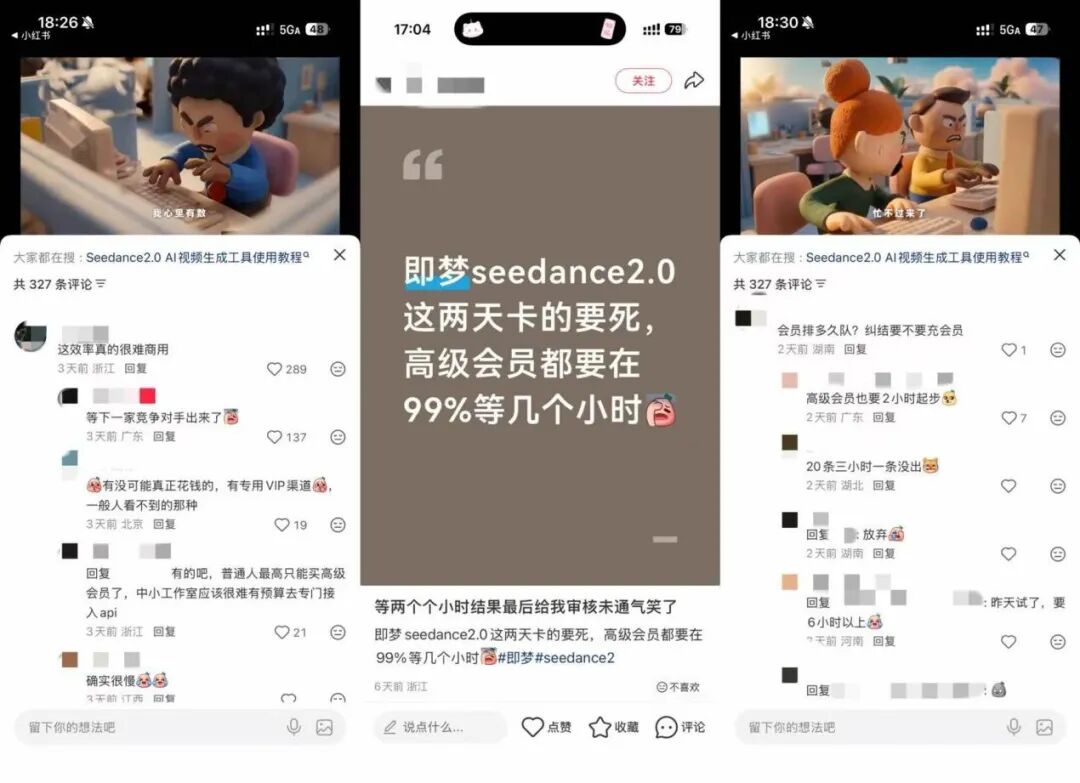 2月26日,Seedance2.0更是因排队时间太长登上微博热搜。不少用户在微博、小红书等社媒平台表示,“用即梦AI Seedance2.0生成短短10秒视频,普通会员要等6-8小时,排队人数上万”“高级会员都要在99%等几个小时”“高级会员也要2小时起步”。