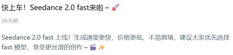 即梦AI同时宣布上线Seedance2.0 fast版本,来源:即梦