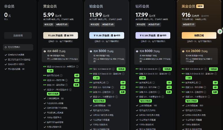 如即梦AI会员分成基础会员、标准会员和高级会员三个等级,有连续包年、连续包月和单月购买三种订阅方式。以连续包月为例,基础会员每月收费69元,可获得1080积分,最多能生成108个视频;标准会员199元/月,每月4000积分,最多生成400个视频;高级会员499元/月,每月15000积分,最多能生成1500个视频。