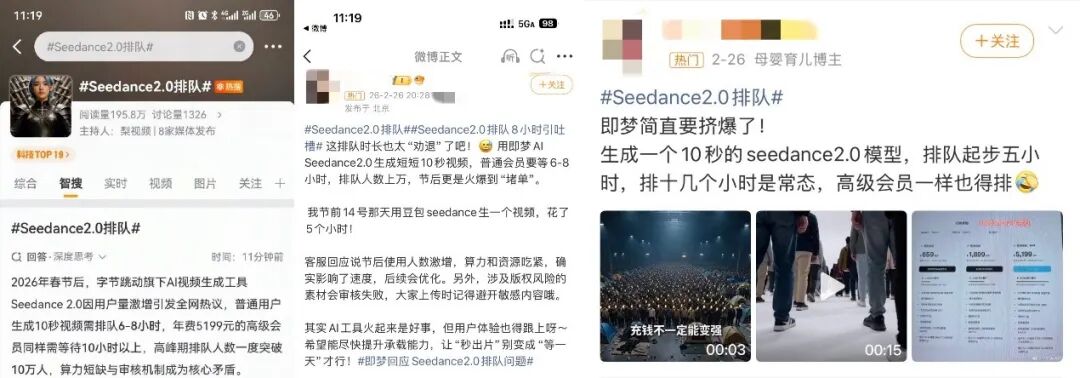 2月26日,#Seedance2.0排队# 的词条登上微博热搜,相关话题已有近300万的阅读量,位于当日科技榜top2。