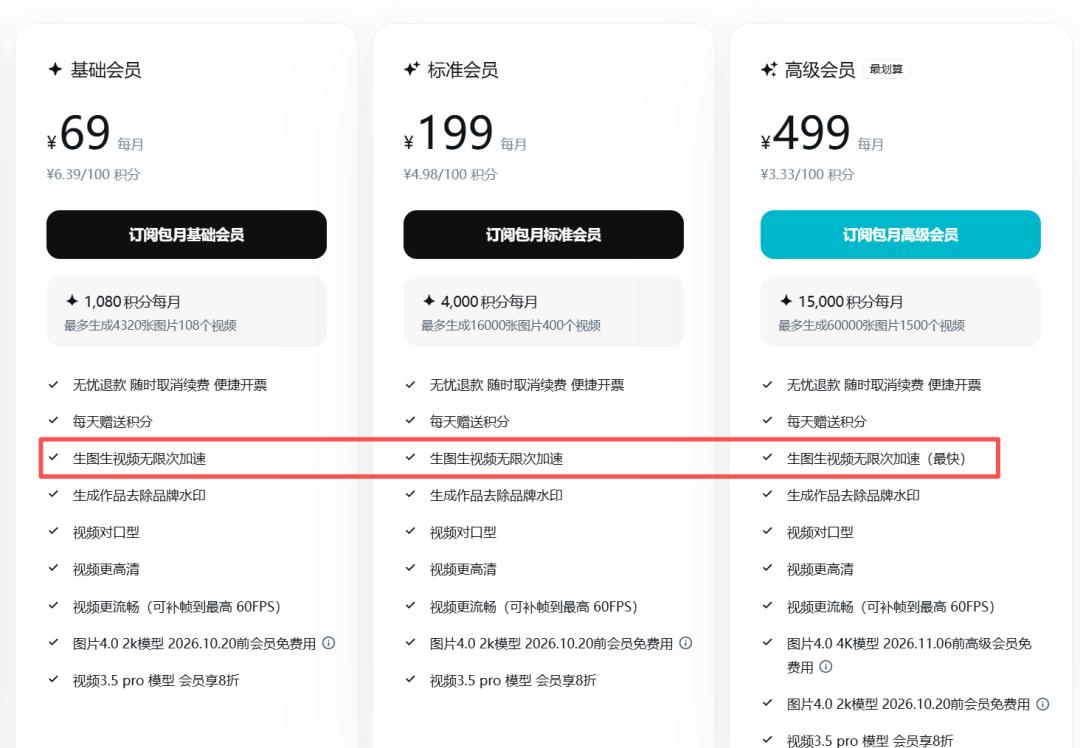 此外,即梦AI会员权益中标注,会员可享生图生视频无限次加速,高级会员(499元/月)最快。