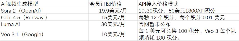API接入价格方面,国外主流模型目前采取的都是积分制。如,Sora 2每10s视频需要消耗30积分,50美元能购入1800API积分;Runway(Gen-4.5系列)每秒视频消耗 12 个积分,每个积分 0.01 美元。