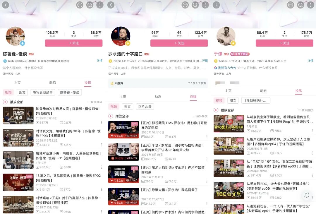 而在视频播客赛道动作最为密集的,则是B站。2025年2月,B站发起“上B站看播客”创作者招募计划;7月又在全网率先推出“视频播客”内容品类,并同步推出扶持计划“视频播客出圈计划”。随后,鲁豫、罗永浩、于谦、杨迪等艺人以及媒体、UP主纷纷在平台推出视频播客节目。
