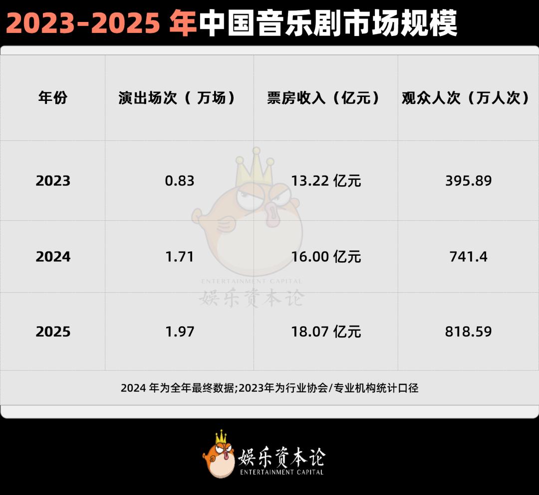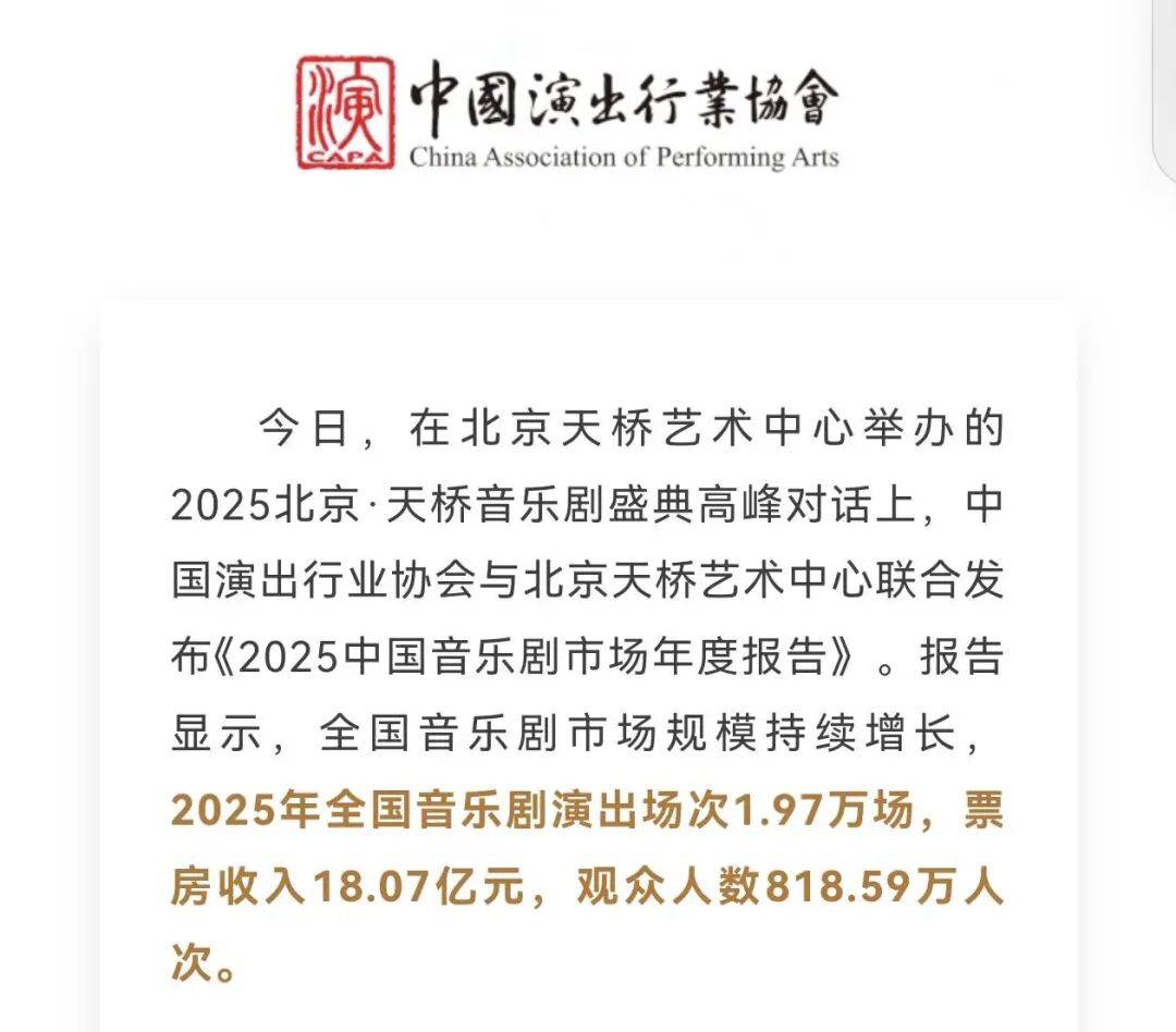 其实仔细研究中国的音乐剧市场也可以发现类似的趋势,《2025中国音乐剧市场年度报告》。报告显示,2025年全国音乐剧演出场次1.97万场,票房收入18.07亿元。据媒体新浪乐迷公社透露,张艺兴主演的国家话剧院原创音乐话剧《受到召唤·敦煌》,累计票房突破1.4亿元,创下单场千万级票房的行业纪录。陈丽君也带动了越剧市场的发展。