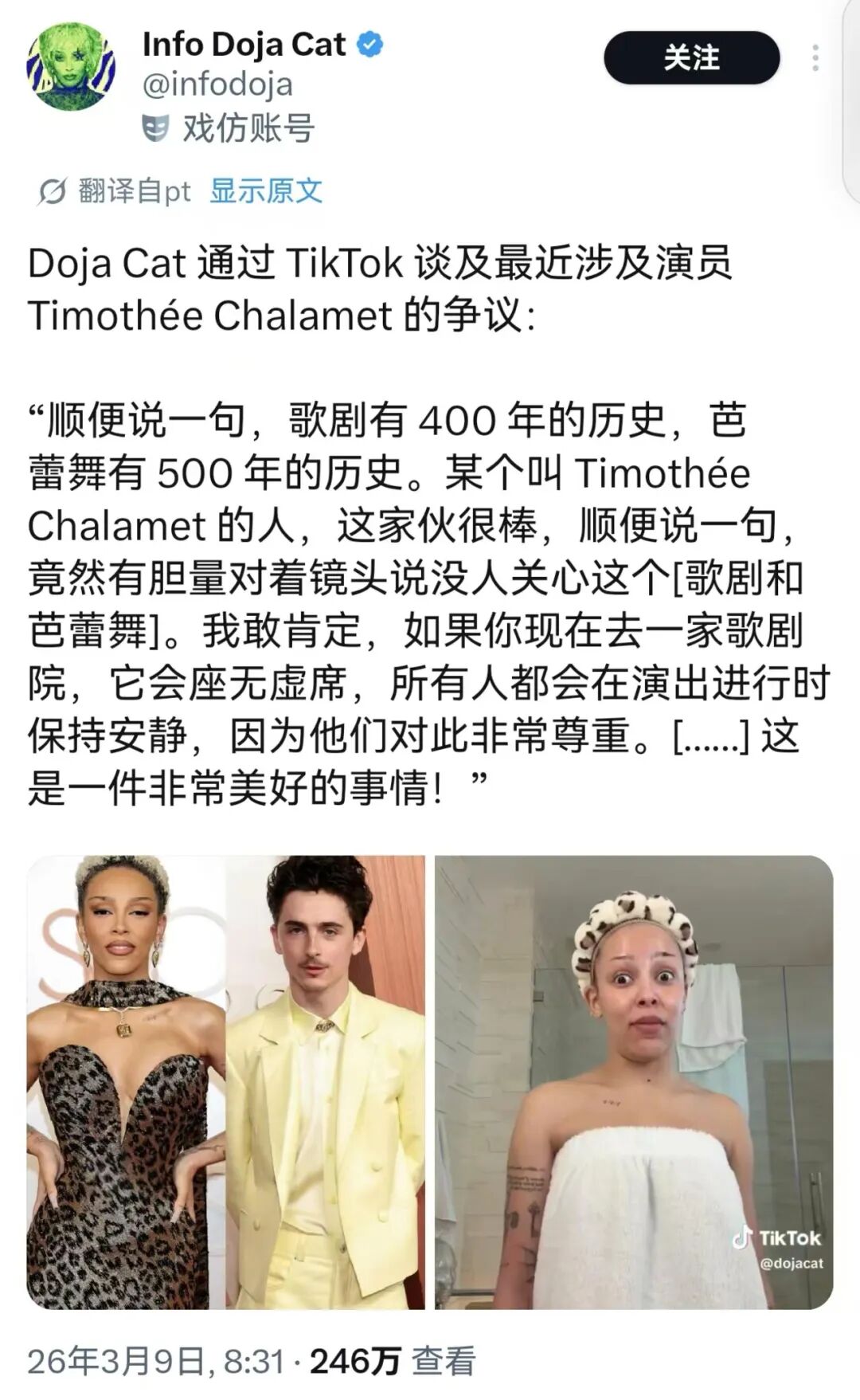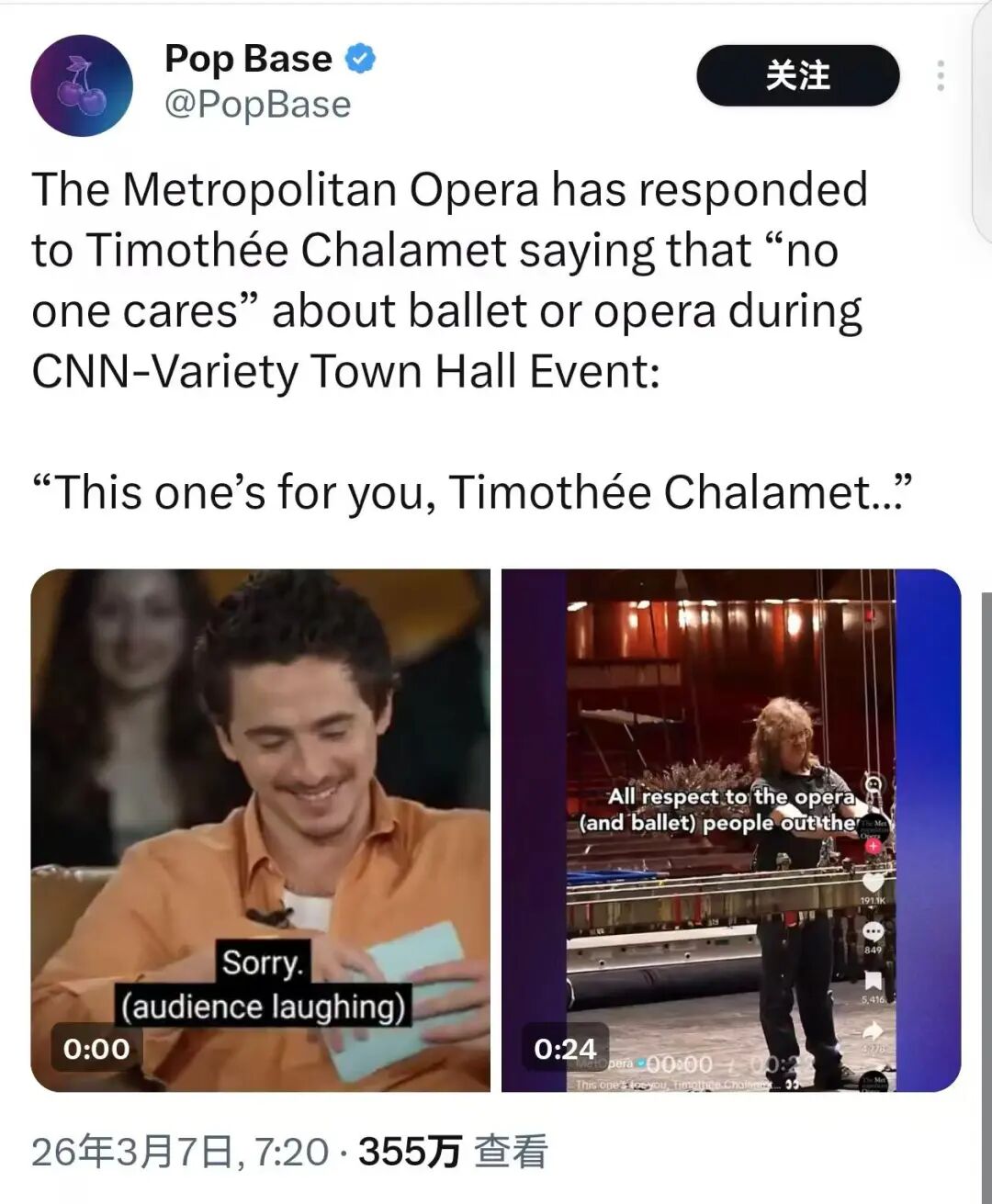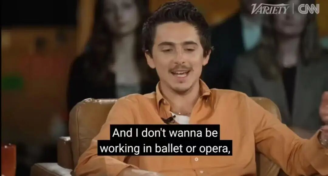 起因是他前不久在《周六夜现场》中与马修·麦康纳探讨如何保持电影院的活力(怎么和中国电影圈讨论的一样),在谈到不希望电影沦为需要人们刻意去“拯救”的艺术形式时,甜茶表示“自己不想在芭蕾舞或歌剧领域工作,因为在那些领域人们总是呼吁要让它活下去,即使大家觉得已经没有人在乎这些了”。尽管他在说完后立刻笑着找补,称“对所有芭蕾舞和歌剧工作者抱有敬意”,但这番言论依然被截取并在社交媒体上疯传。