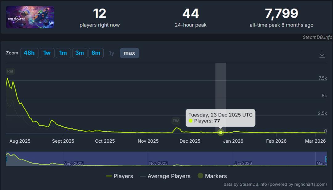 不过即便如此,《头号追击》最终所获得的市场反馈还是堪称惨淡。SteamDB显示,游戏上线后的在线人数峰值仅为1.5万人,尚不及测试时期(4.7万)的三分之一。而到了10月份左右,该作在Steam平台的在线人数就已经跌破千人,就连正常匹配对局都成了不小的问题。