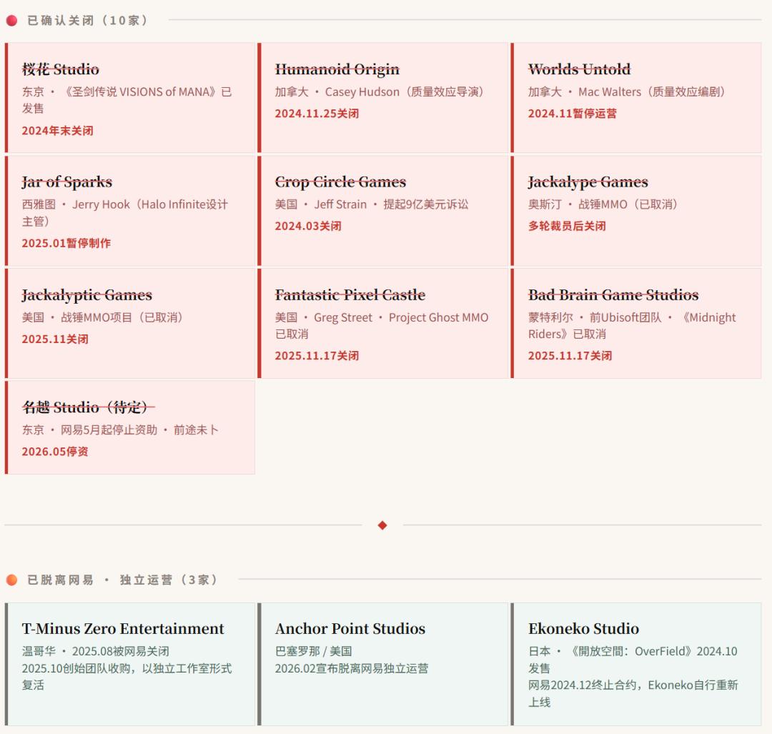 从2024年底算起,网易已经先后关闭或撤资了至少10家海外工作室,另有3家宣布脱离网易独立运营。其中,仅有樱花工作室(《圣剑传说 VISIONs of MANA》)和Ekoneko Studio(《开放空间:OverField》)在关闭/脱离网易之前有过实打实的作品产出,其余工作室的在研项目大多还没到对外测试阶段,便被网易直接裁撤放弃。