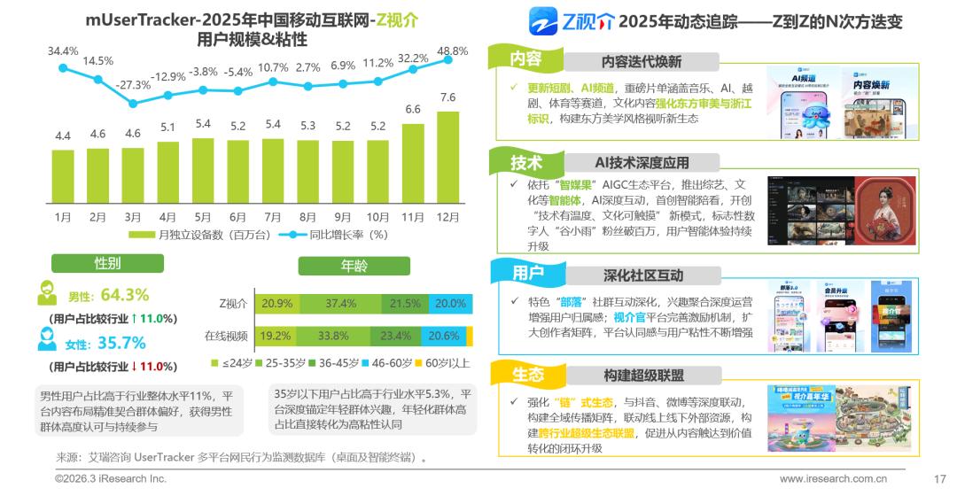 2025年,Z视介整体流量大幅跃升,11、12月迎来爆发式增长,月用户数创新高,平台深耕精品化、差异化内容布局,深受核心用户青睐,获高度文化认同;依托系列化举措,Z视介实现内容、技术等全面焕新,完成Z到Zⁿ生态价值跃迁,稳步推进“视听新物种”平台定位,加速建设新一代智能互动视听生态,彰显平台强劲的创新活力与行业引领力。