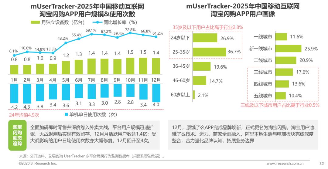 2025年,淘宝闪购借外卖大战实现用户规模与市场份额的快速跃升;大战退潮后,平台不仅成功留存用户,用户使用行为亦得到有效修复。在用户结构上,淘宝闪购于青年群体及低线城市建立起显著优势。得益于阿里本地生活与电商业务的深度整合,淘宝闪购在即时零售领域竞争力持续增强,发展势头迅猛。
