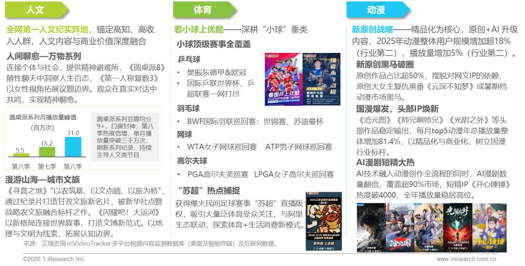 优酷在人文、体育、动漫等垂类领域,通过差异化战略与深度内容布局,建立“心智清晰、壁垒坚实”的鲜明平台标识:以“人间聊愈,漫游山海”构筑全网第一人文纪实高地,锚定高知高收入人群;以“看小球上优酷”抢占体育内容差异化赛道,实现小球顶级赛事全覆盖;以“新原创+AI”驱动国漫精品化升级,推动原创破圈与头部IP焕新并进。多领域差异化布局,全面塑造“有深度、有态度、有温度”的长视频平台。