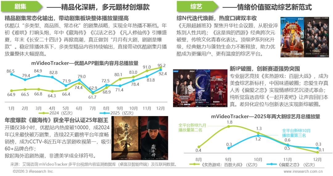 2025年优酷剧集与综艺表现亮眼:剧集精品化战略下实现全年热播不断档,形成“月月有大剧,剧剧是爆款”的精品矩阵,直接带动剧集板块播放量显著提升;综艺以“综N代焕新+新IP破圈”双轮驱动策略实现热度口碑与商业价值的双重突破。平台实现剧综并进、精品常新的品质标杆与创新引领定位,展现强大综合竞争力。