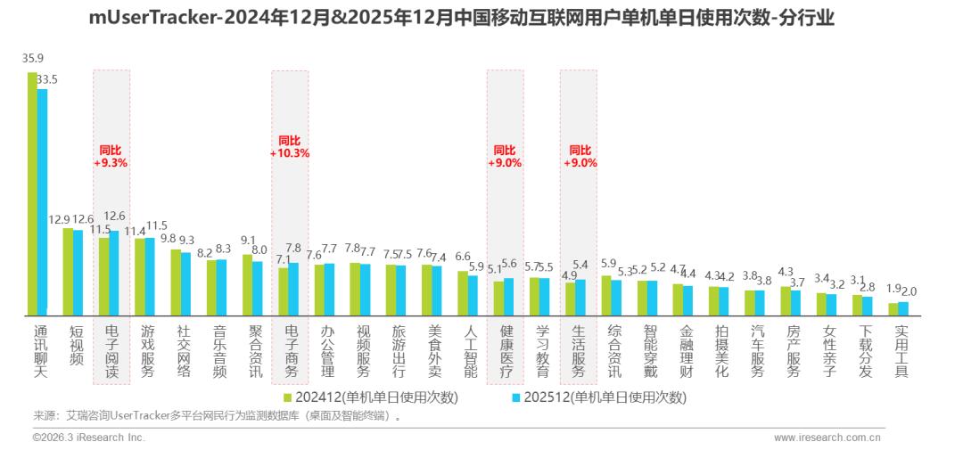 艾瑞监测数据显示,2025年12月,用户日常高频应用集中于通讯聊天(日均33.5次),其次为短视频、电子阅读及游戏服务(均超10次),共同构成核心使用场景;同期高增长应用表现突出,电子阅读(+9.3%)、电子商务(+10.3%)以及健康医疗与生活服务(+9.0%)均实现稳定增长。艾瑞咨询认为随着用户对本地化、个性化服务需求的提升,生活服务类应用的刚性特征将持续推动其使用频次增长。