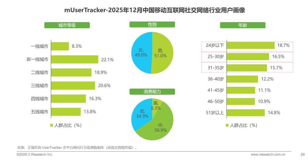 2025年,中国移动互联网社交网络用户结构特征鲜明,女性用户占比已接近半数,显著高于其他行业,成为“她经济”在数字社交中核心驱动力;35岁以下用户群体为社交网络主力军,占比超过60%,展现出较高内容参与意愿与社交黏性,此类人群不仅对新兴社交形式接受度高,也更倾向于通过社交平台表达个性、建立圈层认同。