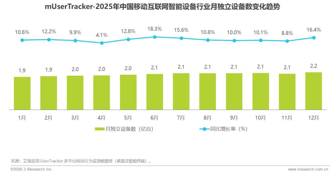 2025年智能设备行业月独立设备数实现稳健增长,规模突破2亿,显示相关产品在消费市场的进一步渗透与普及。艾瑞咨询认为,增长主要由产品创新迭代、场景多元拓展与用户体验持续优化驱动,表明用户对智能化生活的需求正从尝鲜阶段迈向常态化与依赖阶段,行业整体进入规模化、生态化发展新阶段。