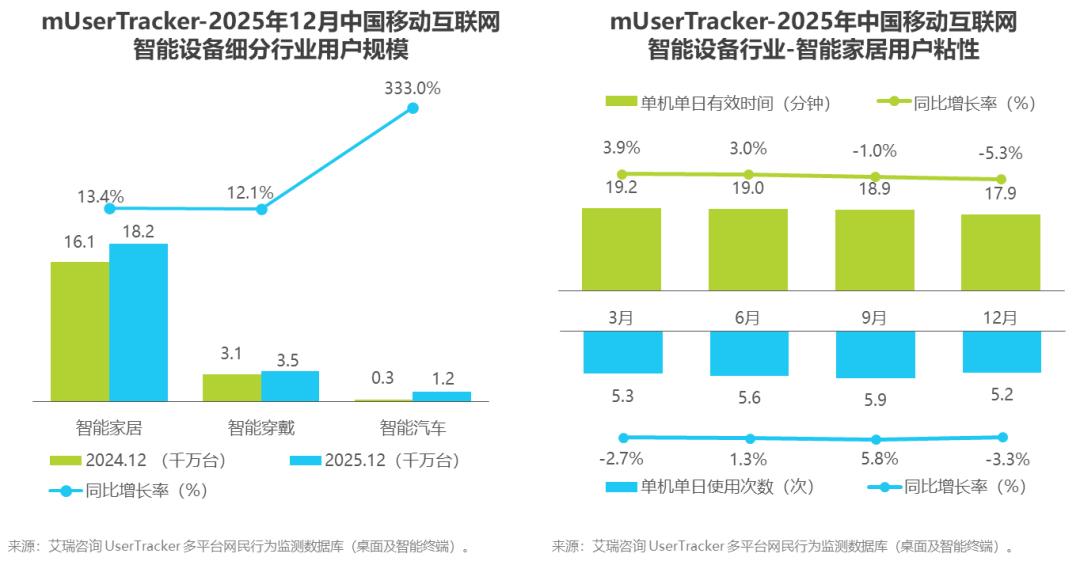 2025年12月,智能设备行业各细分赛道均实现同比正增长,整体发展态势向好。其中智能家居领域表现突出,用户规模达1.82亿台,稳居智能设备细分赛道用户量首位,同比增长13.4%,且用户使用行为保持整体稳定;智能穿戴领域稳步增长,用户规模达0.35亿台,同比增幅12.1%;智能汽车领域迎来爆发式增长,用户规模达300万台,同比增幅超300%。