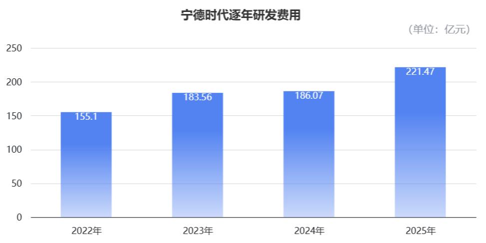 2025年,宁德时代的研发费用为221.47亿元,同比增长19.0%,占营收的5.23%。