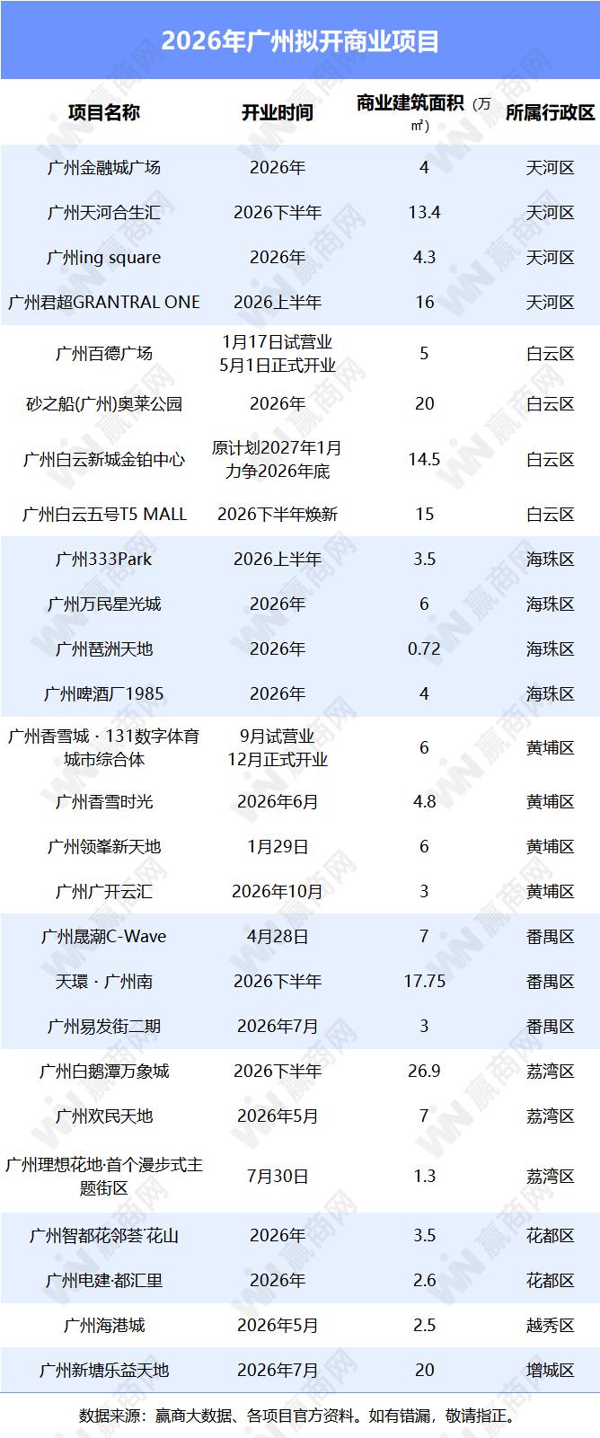 根据赢商大数据不完全统计,包括这些项目在内,2026年广州拟开商业体共26个(含焕新),预计将带来近218万㎡新增供应。