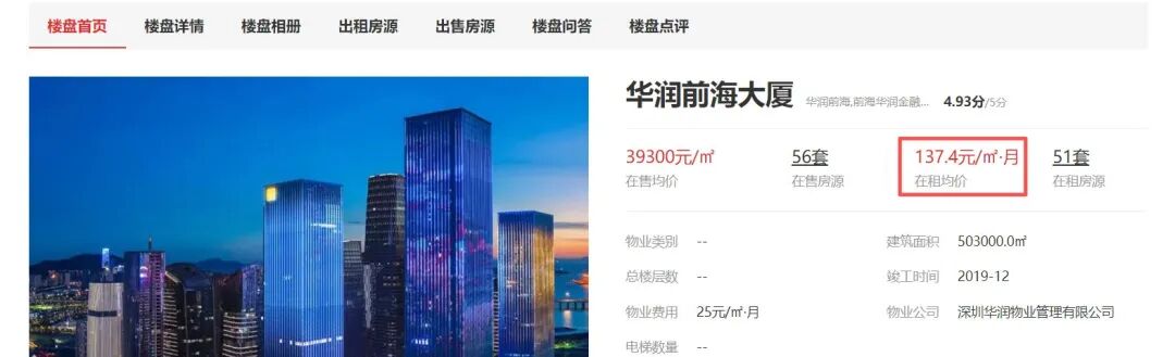 以前海深港梦工场项目为例,在该项目周边的写字楼包括华润前海大厦、卓越前海壹号、前海鸿荣源中心等。据深圳房天下数据,华润前海大厦的在租均价约137.4元/(平方米·月);卓越前海壹号写字楼在租均价约137.1元/(平方米·月)。