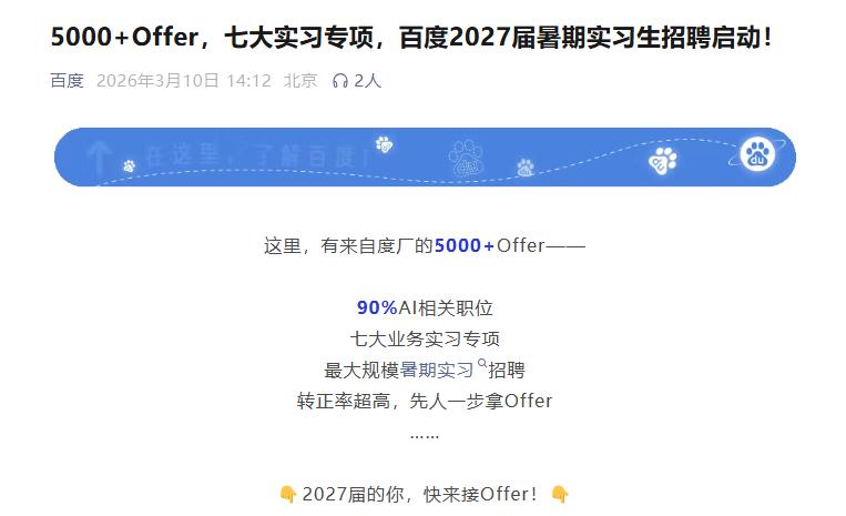 3月10日,百度决定启动2027届在校生暑期实习项目。值得一提的是,尽管本次百度提供了超5000份实习offer,但该计划中超90%的岗位与AI相关,且大多涉及大模型算法、多模态、自动驾驶等前沿方向。