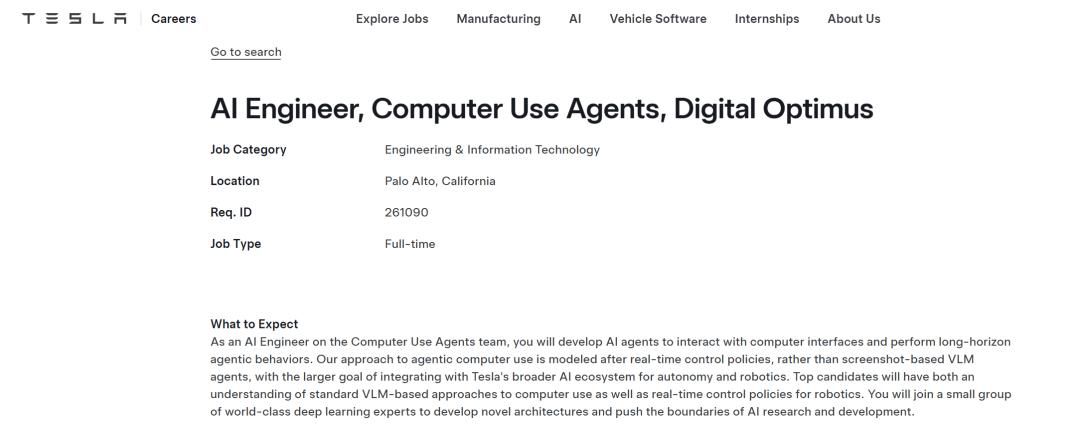 特斯拉的招聘网页也显示,今年2月出现了一个AI工程师的岗位,核心岗位描述就是开发“能使用电脑的AI代理”——能够执行“自主软件交互、代码生成和实时决策”等任务。