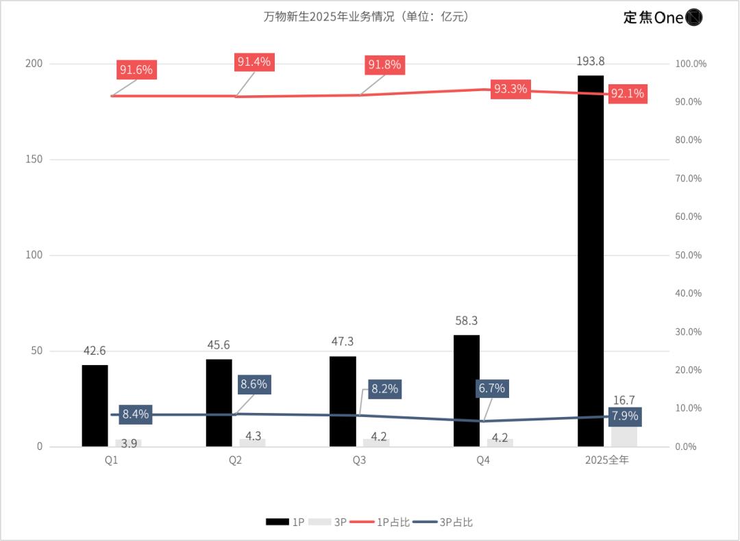 2025年全年,万物新生总营收达210.5亿元,其中1P自营业务收入193.8亿元,占比高达92.1%,且四个季度营收占比均超九成;3P服务业务收入16.7亿元,同比增长12.4%,虽为高毛利辅助板块,但规模占比仅7.9%,尚未形成能与1P并行的第二增长曲线。