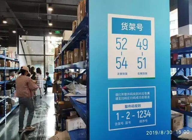 这是最原始的取件方式,其实也是所有取件方式的本质。我还记得本科时期的双十一,快递多到要放在体育馆(浙江大学学生的购买力实在不是盖的),我第一次收到所谓的 X-X-XXXX 的取货短信时一脸茫然,到了体育馆才知道是货架-层数-快递编号。但这种方式的弊端在于无法在短时间内承接大量的人流量,很容易造成所有人堵在货架前找货的情况。