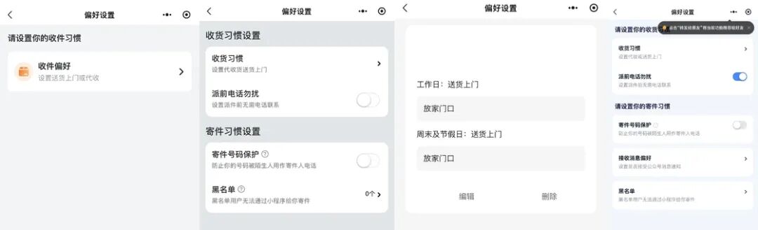 首先,我们需要将自己在所有快递平台上的收货偏好设置为送货上门,这一步设置可以在快递公司的小程序上设置完成。以中通为例,设置路径为「我的 > 常用工具 > 偏好设置 > 收货习惯」,其他家的设置路径也大同小异。值得注意的是,这个功能似乎已经非常高频被用户使用,一些快递公司已经把它直接放在了设置中非常显眼的位置,路径大大缩短。这也能从侧面反映出,快递公司可能被用户投诉困扰,也开始重视快递不能送货上门的问题。