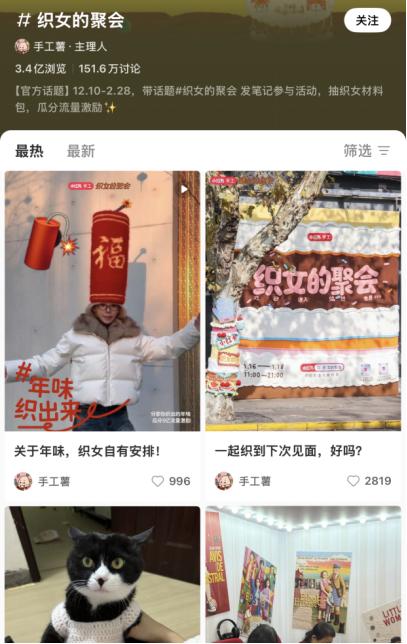 在国内,抖音上“手工编织”话题播放量高达234亿;小红书“织女日常”词条已经有700万+讨论、13.6亿浏览量,比较新的“织女的聚会”词条也有3.4亿浏览量。