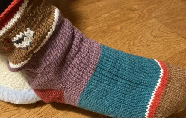 脖子僵硬,手腕酸痛,但看着已经初见形状的毛袜子,心里就很踏实。她用了棕色和绿色的毛线,还用白色的毛线“绣”了一只小小的羊上去。妈妈属羊,这双袜子是给她织的。