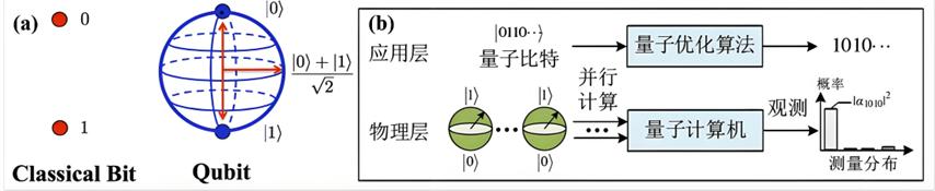 图1:(a)经典比特与量子比特对比示意图 (b)量子计算流程示意图