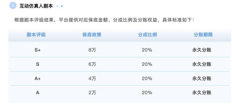 有意思的是,当时公告还提到,真人短剧剧本合作政策不变。而翻开过去的短剧合作政策,可以发现,同样是S+的剧本,保底政策是20万,分成比例是25%,都比AI仿真人剧要高。